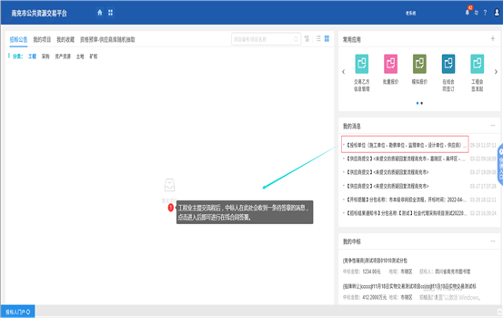 登錄完成后進(jìn)入首頁,選擇(南充市公共資源交易中心-新)進(jìn)入系統(tǒng),如下圖: