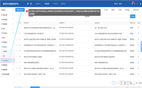 業(yè)主單位需以交易甲方身份登陸系統(tǒng),然后進(jìn)入工程業(yè)主直接發(fā)包中的在線合同簽訂里新增在線合同,如下圖: