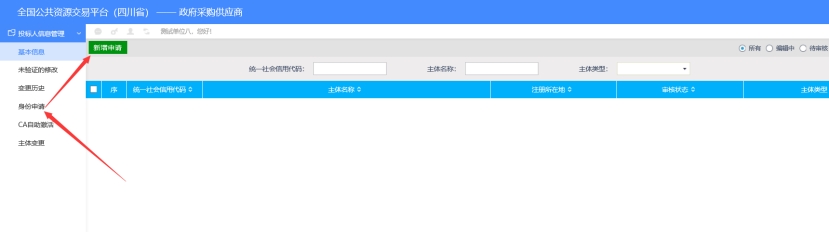 1、點(diǎn)擊身份申請(qǐng)頁(yè)面的“新增申請(qǐng)”按鈕:
