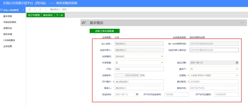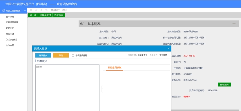3、完成后點(diǎn)擊“下一步”,進(jìn)入頁(yè)面最后點(diǎn)擊“提交信息”,等省交易中心審核通過后即可: