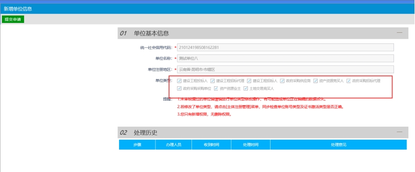 2、在身份新增頁(yè)面,勾選需要增加的身份類型(注意此處已申請(qǐng)的身份無法刪除),完成點(diǎn)擊左上角的“提交申請(qǐng)”,等省交易中心審核通過即可: