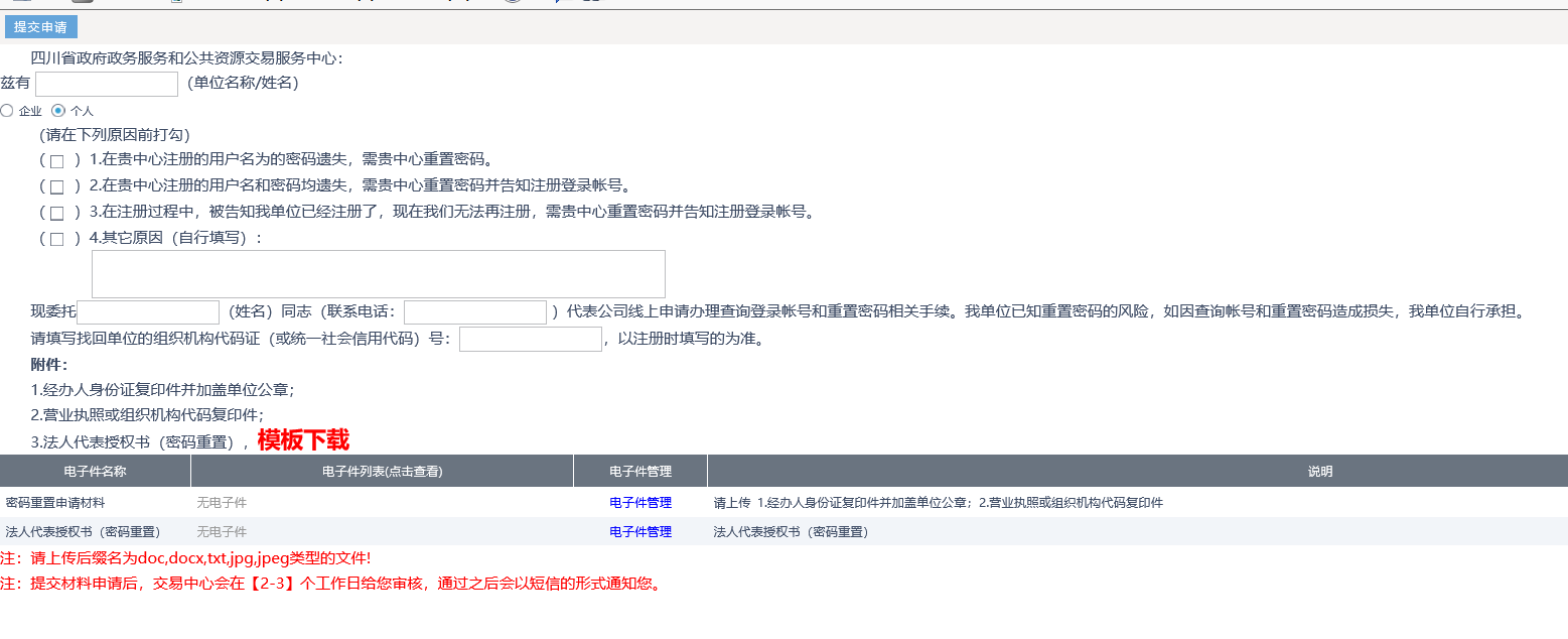 2、填寫相關資料,點擊【提交申請】按鈕提交審核。如需加急處理,請聯(lián)系交易中心,審核通過后,在您預留的手機號碼上會收到短信通知,短信上會告知賬號和密碼。電話:028-12345