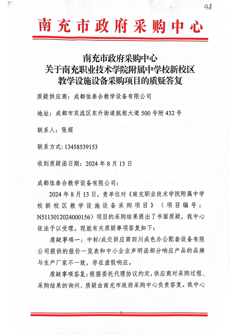 南充市政府采購中心關(guān)于南充職業(yè)技術(shù)學(xué)院附屬中學(xué)校新校區(qū)教學(xué)設(shè)施設(shè)備采購項(xiàng)目的質(zhì)疑答復(fù)(成都佳泰合教學(xué)設(shè)備有限公司)