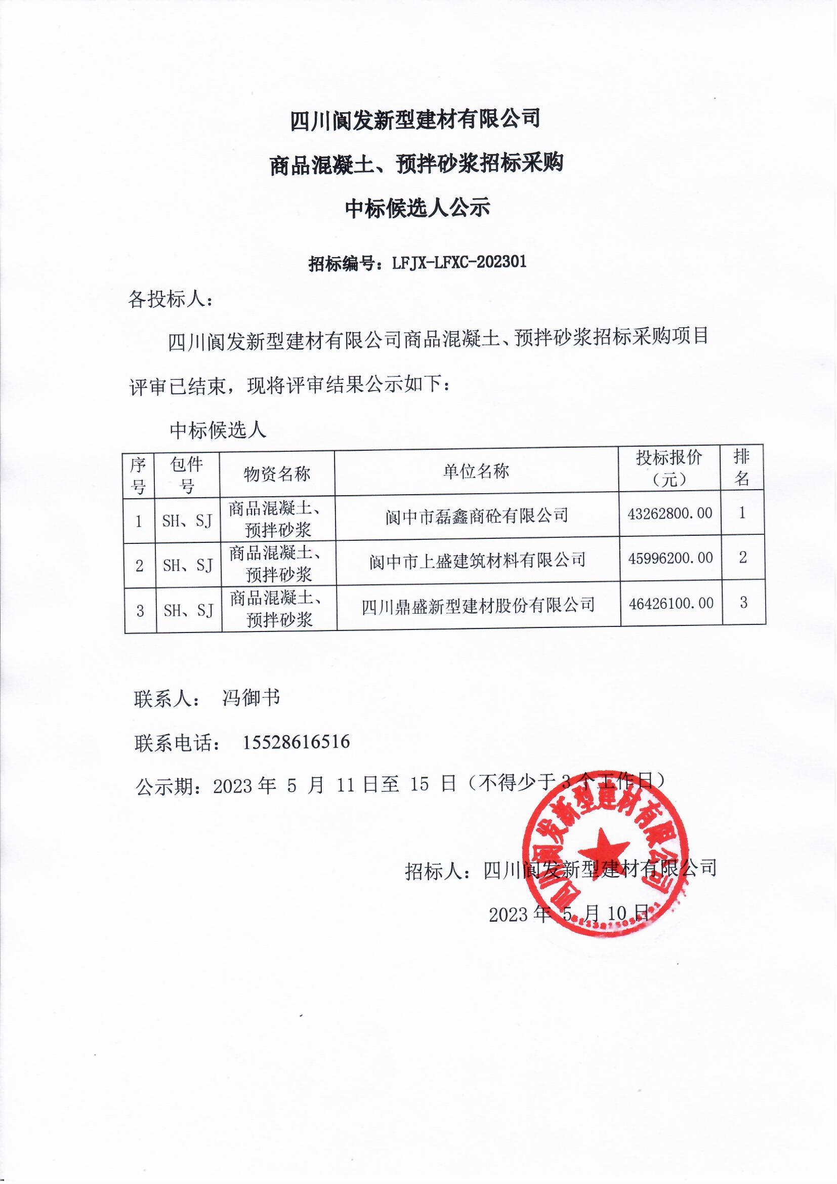 四川閬發(fā)新型建材有限公司商品混凝土、預(yù)拌砂漿招標采購中標候選人公示