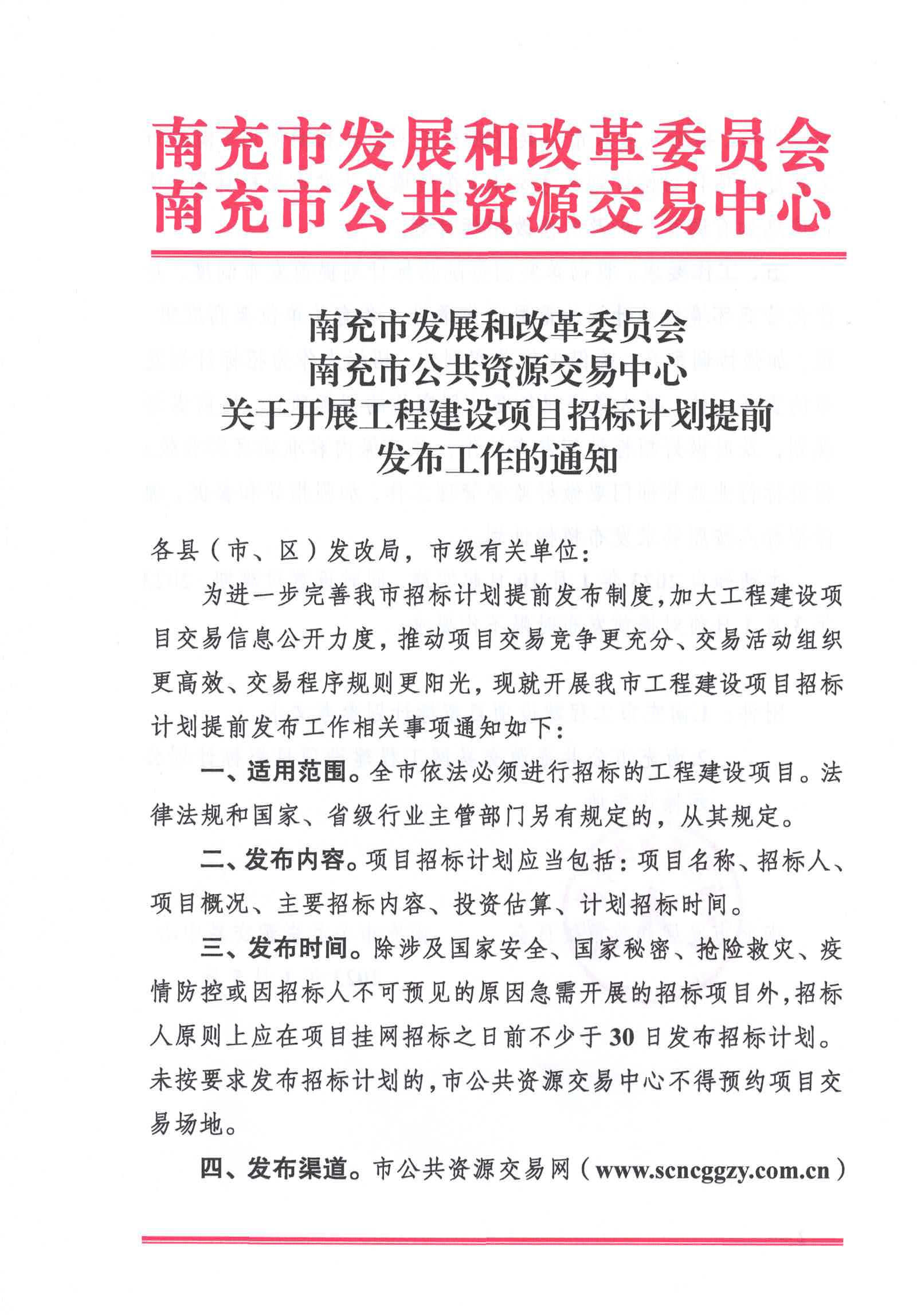 南充市發(fā)展和改革委員會(huì)、南充市公共資源交易中心關(guān)于開展工程建設(shè)項(xiàng)目招標(biāo)計(jì)劃提前發(fā)布工作的通知