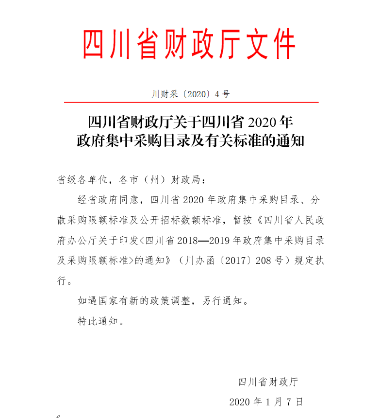 四川省財政廳關(guān)于四川省2020年政府集中采購目錄及有關(guān)標(biāo)準(zhǔn)的通知