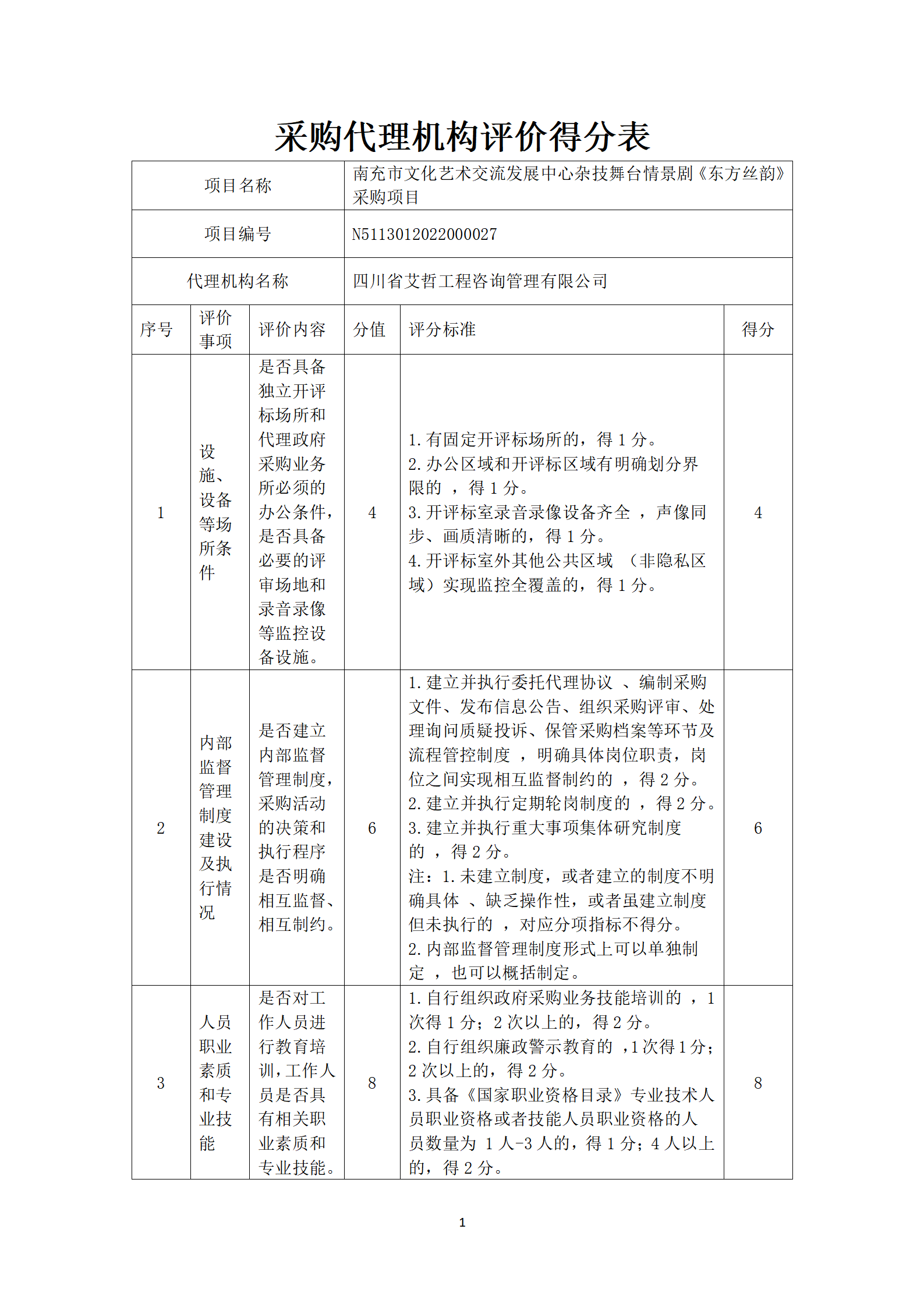 南充市文化藝術(shù)交流發(fā)展中心雜技舞臺(tái)情景劇《東方絲韻》采購(gòu)項(xiàng)目采購(gòu)代理機(jī)構(gòu)評(píng)價(jià)